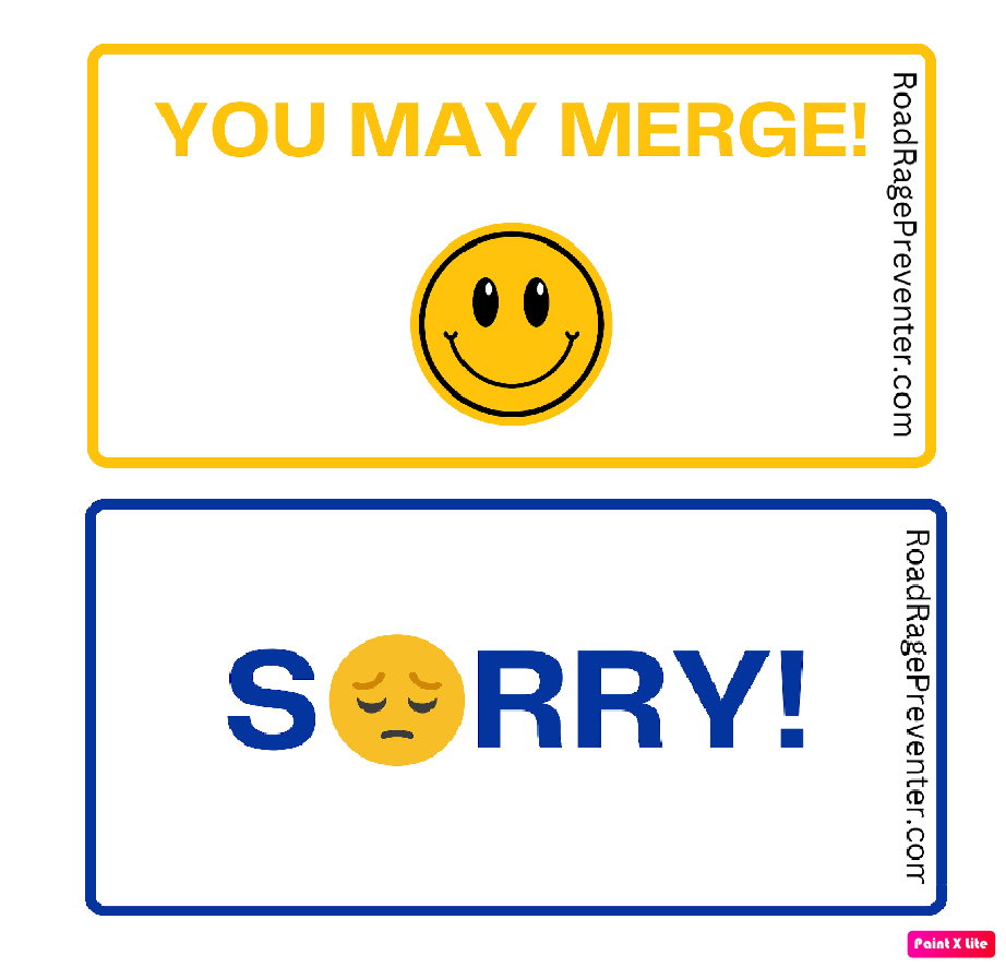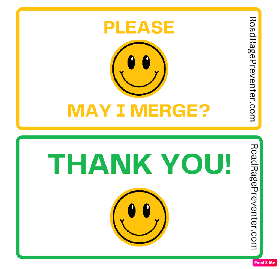 Double sided, quick flip sign featuring “May I Merge?”/”Thank you!”